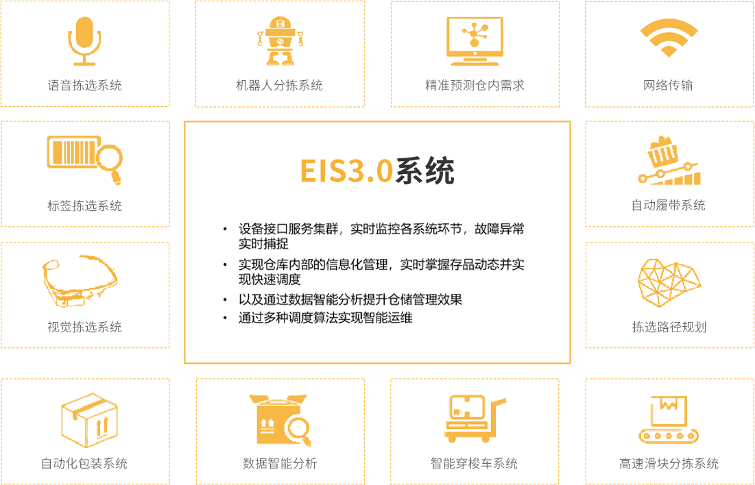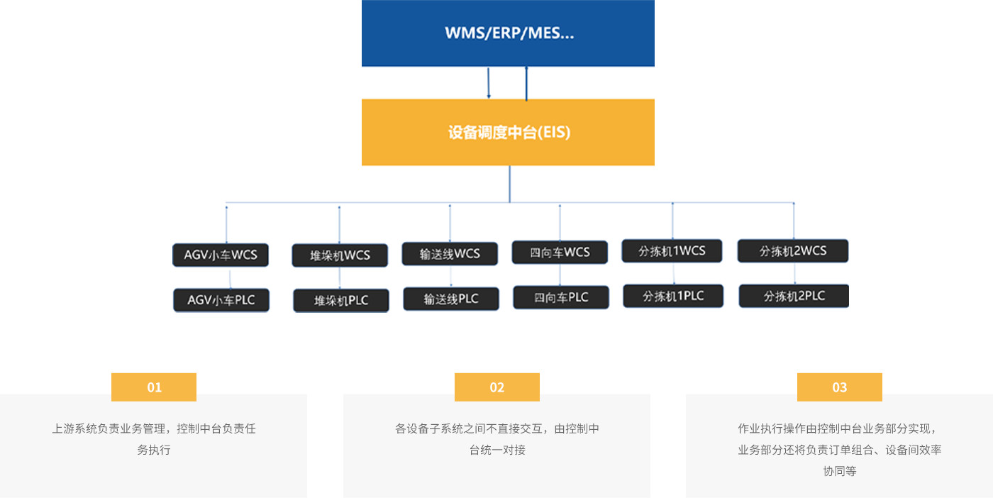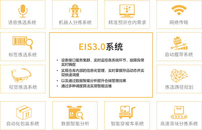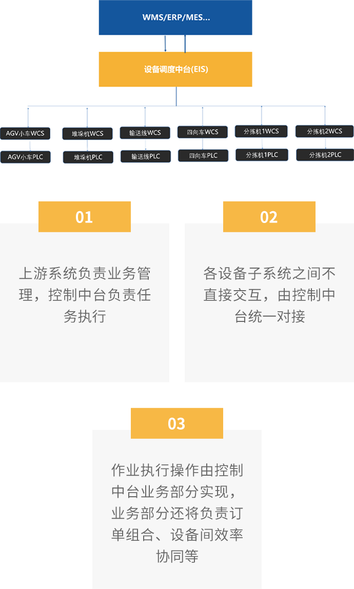 EIS是一套倉(cāng)儲(chǔ)整體設(shè)備集成與作業(yè)執(zhí)行系統(tǒng),承接WMS訂單任務(wù)執(zhí)行,解放WMS, 讓其更加專注于業(yè)務(wù)處理。系統(tǒng)關(guān)鍵性在于解決系統(tǒng)與設(shè)備之間的互連和互操性問題。 解決各類設(shè)備、子系統(tǒng)間的接口、協(xié)議、系統(tǒng)平臺(tái)、應(yīng)用軟件互通,通過調(diào)度算法實(shí) 現(xiàn)設(shè)備智能運(yùn)轉(zhuǎn)。